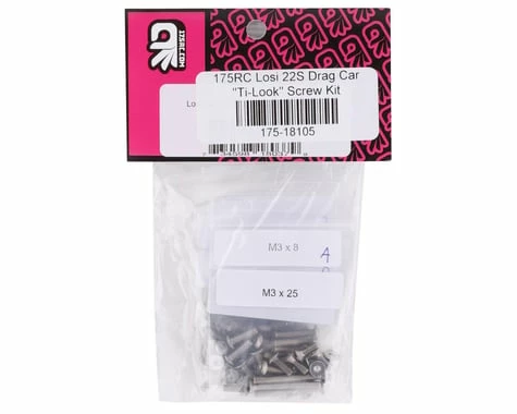 The 175RC Losi 22S Drag Car “Ti-Look” Screw Kit gives your ride the factory look, without the factory price tag. This Ti-Look stainless steel screw kit gives you factory looks at half the cost. Not just a box or bag full of screws, the 175RC screw kit comes in labeled bags with descriptions for an easy install.