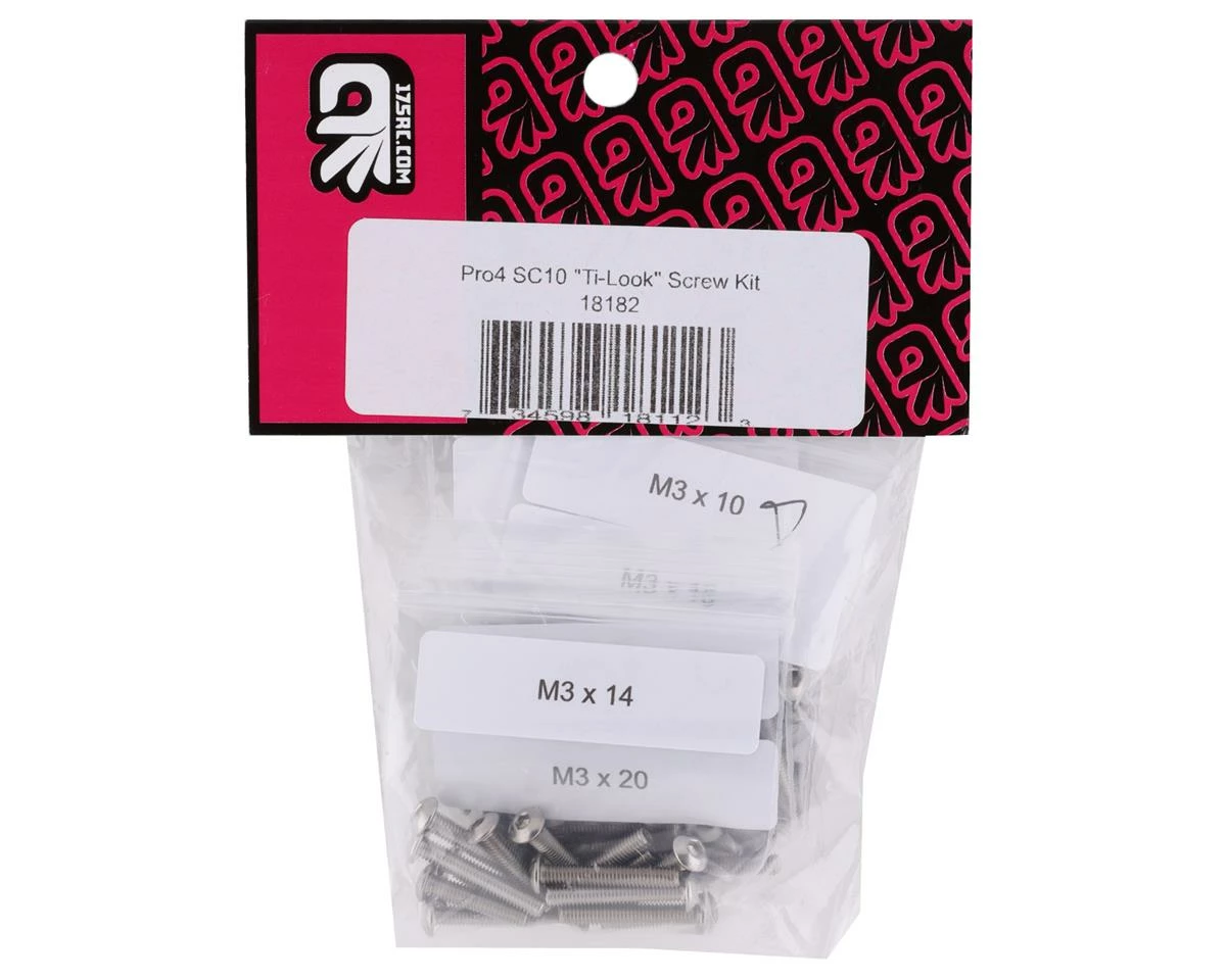 The 175RC Pro4 SC10Â “Ti-Look” Screw Kit gives your ride the Factory look, without the factory price tag. Not just a box or bag full of screws, the 175RC screw kit comes in labeled bags with descriptions for an easy install.