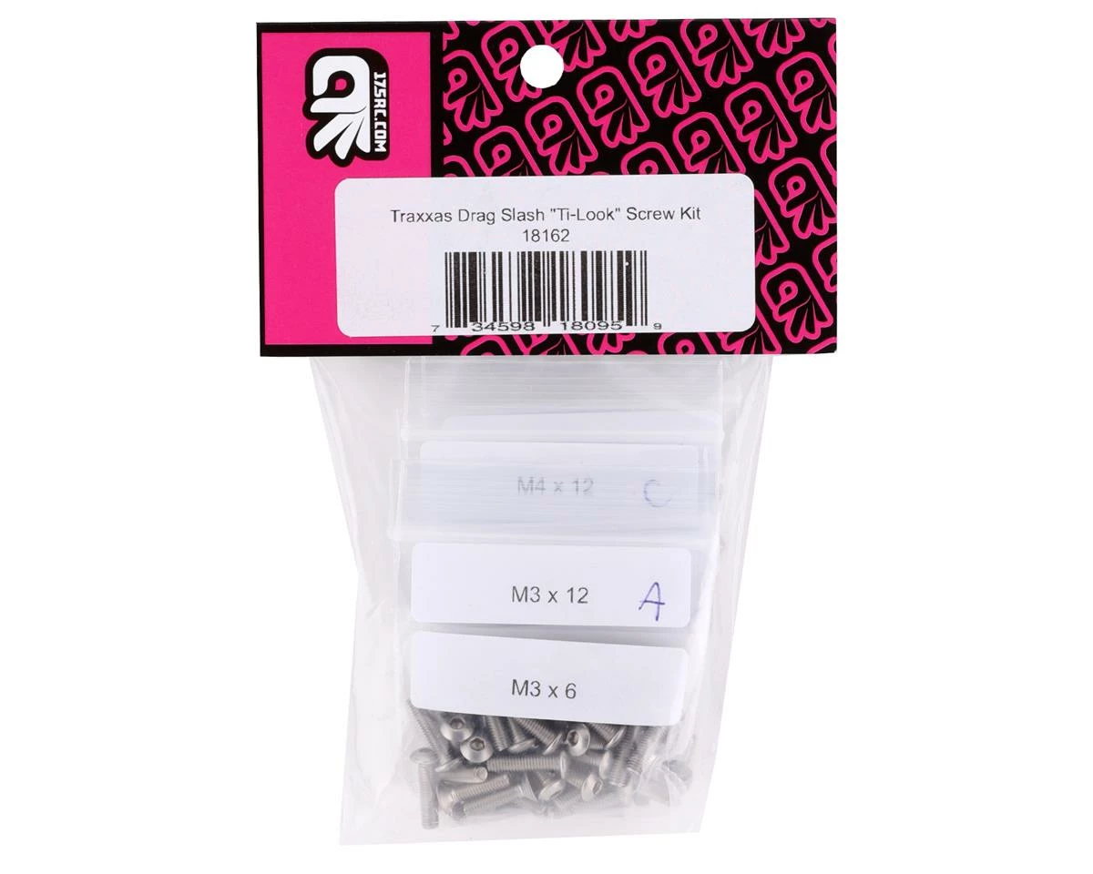 The 175RC Traxxas Drag Slash “Ti-Look” Screw Kit gives your ride the factory look, without the factory price tag. These stainless steel screws are great to add strength and style to your Traxxas Drag Slash. Not just a box or bag full of screws, the 175RC screw kit comes in labeled bags with descriptions for an easy install.