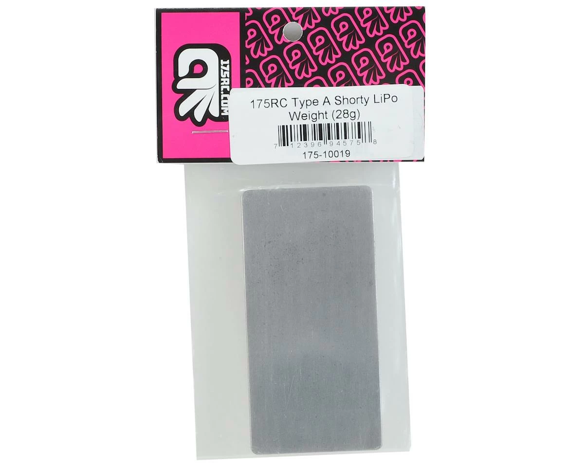 This is the 175RC 28g “Type A” Shorty LiPo Weight. Type A 28 Gram Shorty LiPo Weight lets you take your chassis tuning to the next level. This 28 gram steel weight fits under the battery giving you more weight bias tuning options and helping to lower the CG of the car. The “Type A” weight is a standard type solid plate that measures 92x46mm, and can be combined with Type B, C or D weights to find the perfect balance for your track conditions. Package includes one 28 gram chassis weight.