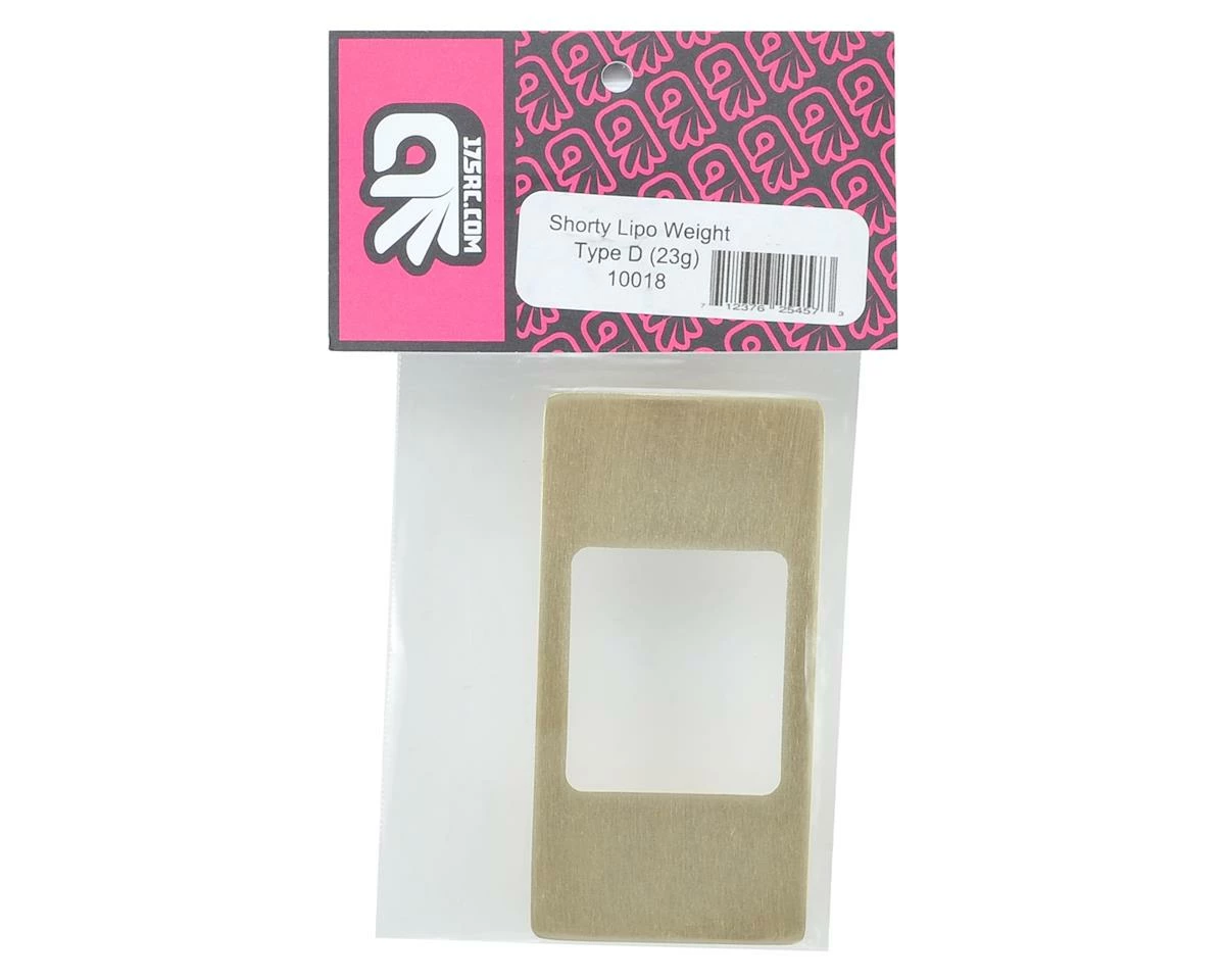 The 175RC Type D 23 Gram Shorty LiPo Weight lets you take your chassis tuning to the next level. This 23 gram weight fits under the battery giving you more weight bias tuning options and helping to lower the CG of the car. The “Type D” weight measures 92x46mm and has been milled in the center to bias the weight closer to the outside of the chassis. This weight can be combined with Type A, B or C weights to find the perfect balance for your track conditions. Package includes one 23 gram Type D chassis weight.