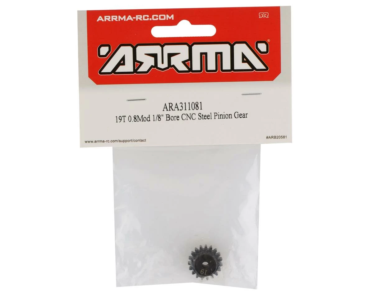 This is an Arrma CNC Steel Mod 0.8 Pinion Gear intended for use with the Infraction 4WD MEGA Truck. This pinion uses a 1/8″ bore and is a Mod 0.8 gear pitch.Â