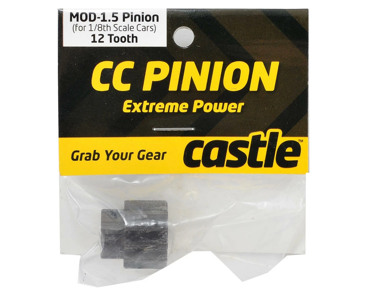 This is a Castle Creations Mod 1.5 CC Pinion Gear. High power applications require a reliable way to get the power from the motor to the drivetrain. Manufactured from hardened steel, with a Mod 1.5 tooth profile and 8mm bore, these pinions are ideal for 1/5 scale electric applications. Choose from 12T, 14T, 16T, or 18T tooth count.