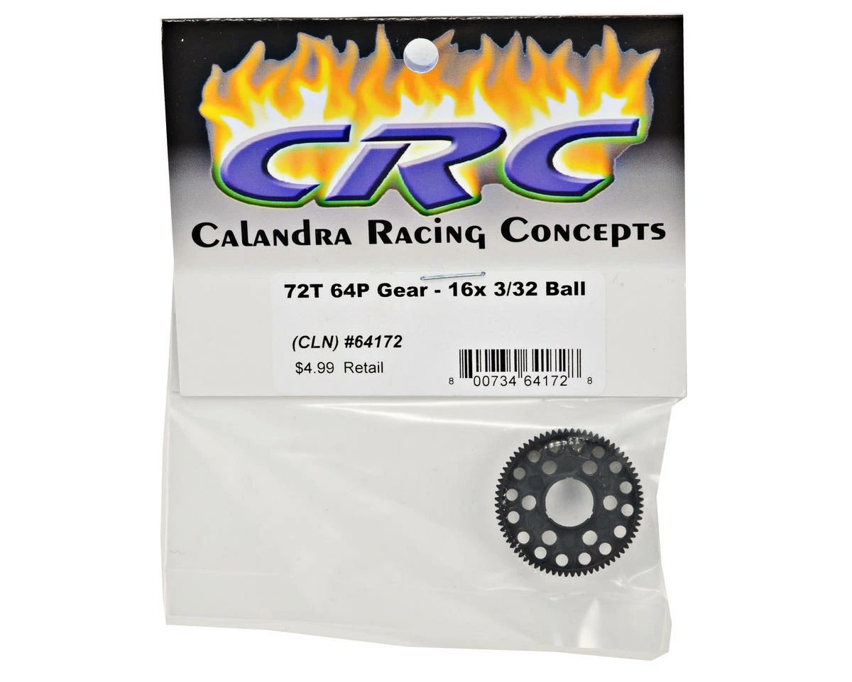 Calandra Racing 64 Pitch 16 Ball Pan Car Spur Gear. This spur gear uses 16 3/32″ diff balls rather than 6 to 12 1/8″ balls. This is done to reduce weight and maintenance by increasing the surface contact area, so less tension is needed on the diff nut to keep the diff from slipping. These gears are available in multiple tooth count options to fine tune torque and top speed.