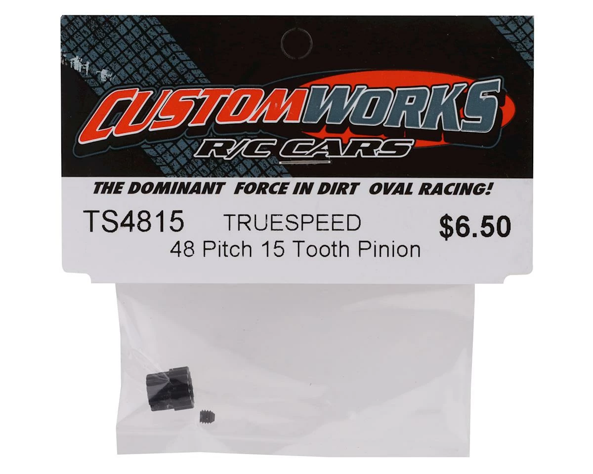 This is a Custom Works Truespeed 48P Pinion Gear, intended for use with 1/10 scale RC cars. These hardened steel 48 pitch pinion gears are available in a variety of sizes to tune your roll out for specific track conditions. Combine with Custom Works Truespeed 48 pitch spur gears for the ultimate in smooth power delivery for your Custom Works chassis.