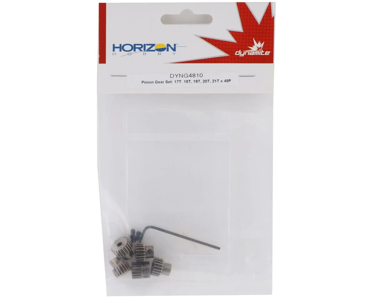 Dynamite 48P Pinion Gear Set. This set includes 17, 18, 19, 20 and 21 tooth pinion gears, allowing you to fine tune your gear ratio for a wide variety of conditions.Â