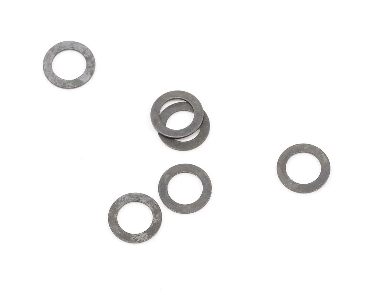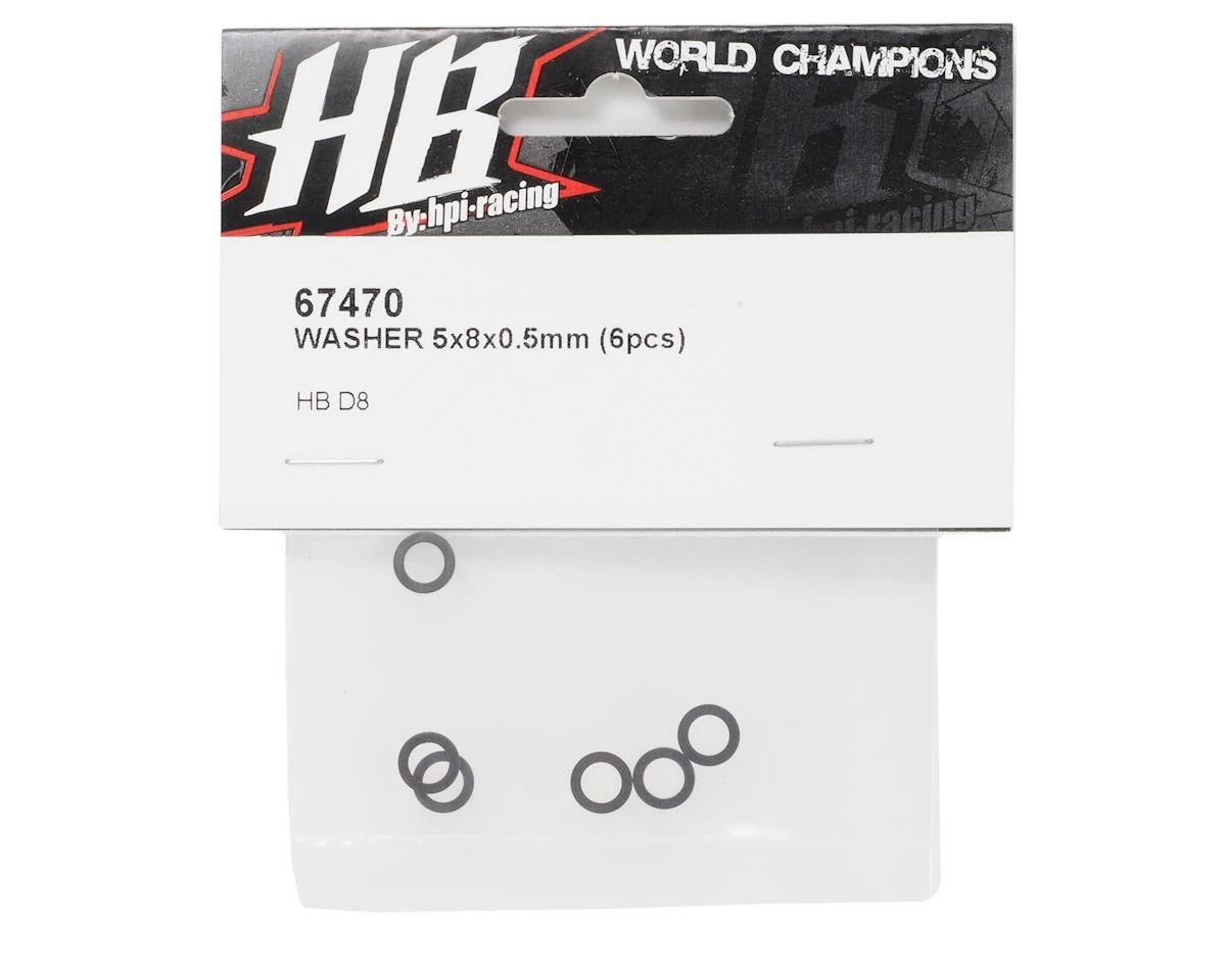 A pack of six 5x8x0.5mm HB Racing Washers.