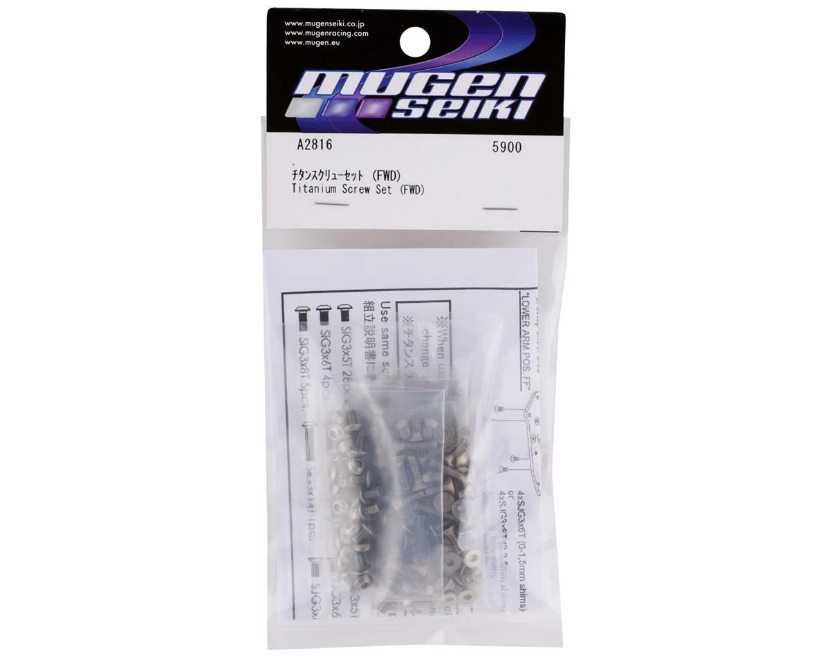 Mugen Seiki MTC2 FWD Titanium Screw Set. This optional screw set is a great way to reduce weight and increase strength. Package includes one screw set.