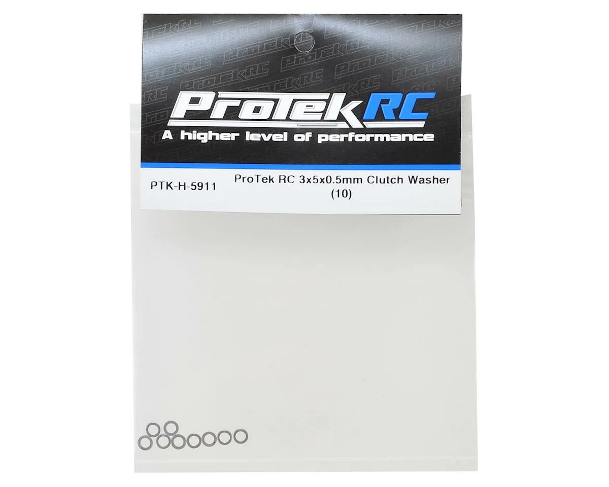 This is a pack of ten ProTek R/C 3x5x0.5mm Clutch Washers. These washershave a 3mm inner diameter, with a 5mm outer diameter and are 0.5mmthick. These can be used in a variety of applications, but are intendedto be installed between an aluminum clutch shoe and the flywheel, andused as clutch shoe shims on any clutch that uses a 3mm pin.Â