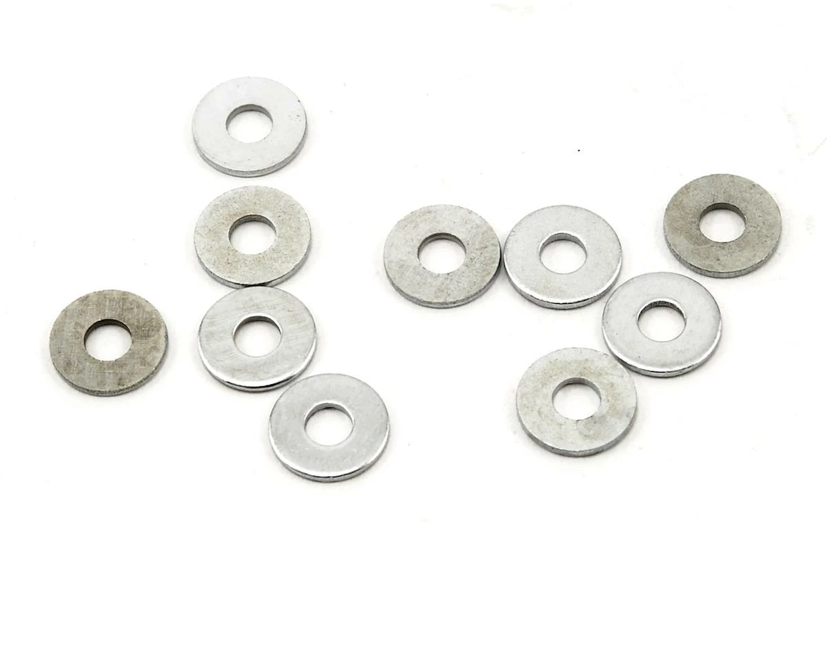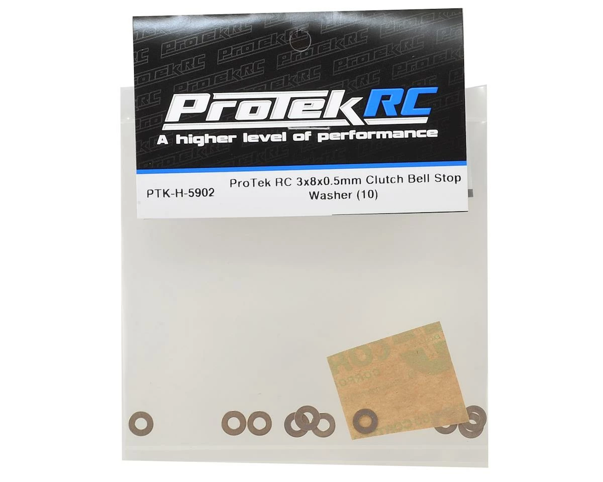 This is a pack of ten ProTek R/C 3x8x0.5mm Clutch Bell Stop Washers. These washers have a 3mm inner diameter, with a 8mm outer diameter and are 0.5mm thick. These can be used in a variety of applications, but are an excellent choice to use as a stop washer on the end of an engine crankshaft to hold the clutch bell and clutch shims in place.
