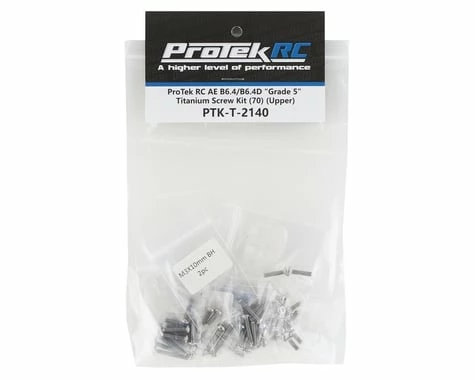 The ProTek R/C AE B6.4/B6.4D Grade 5 Titanium Screw Kit is a 70 piece upgrade that includes the screws needed to replace the stock hardware in the upper half of the chassis. These titanium screws are CNC machined and thread rolled to near-exact tolerances from high-quality 6AL-4V (Grade 5) titanium alloy material and polished to a brilliant finish.Â