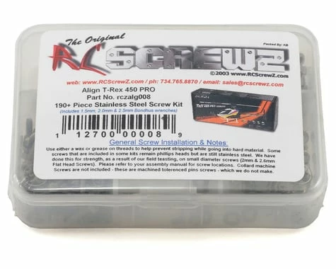 This is a optional RCScrewz Stainless Steel 190 plus piece screw kit for the Align T-Rex 450 Pro. RCScrewz Stainless Screw Kits are 100% complete. Your new kit will include everything needed to do a full conversion and more. Stainless Steel Screw Kits are far superior to the screws that come stock with your RC. RCScrewz kits are made with the best stainless steel money can buy. No more bent, rusted, or corroded screws. Never worry about stripped heads again. You will not find a better screw kit for your RC at any price and RCScrewz Guarantee’s it. If for any reason your not 100% satisfied with your kit, return your screw kit to RCScrewz and they will send you a full refund for the price of the kit.