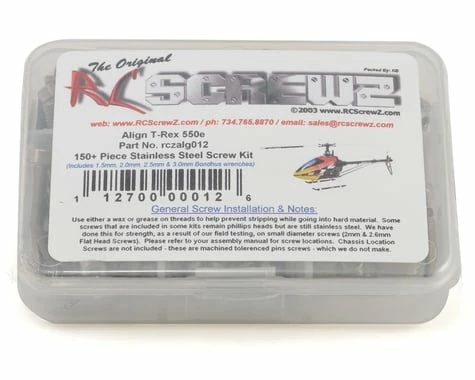 This is a optional RCScrewz Stainless Steel 150 plus piece screw kit forthe Align T-Rex 550E. RCScrewz Stainless Screw Kits are 100% complete.Your new kit will include everything needed to do a full conversion andmore. Stainless Steel Screw Kits are far superior to the screws thatcome stock with your RC. RCScrewz kits are made with the best stainlesssteel money can buy. No more bent, rusted, or corroded screws. Neverworry about stripped heads again. You will not find a better screw kitfor your RC at any price and RCScrewz Guarantee’s it. If for any reasonyour not 100% satisfied with your kit, return your screw kit to RCScrewzand they will send you a full refund for the price of the kit.