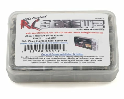 This is a optional RCScrewz Stainless Steel 200 plus piece screw kit for the Align T-Rex 600 Electric. RCScrewz Stainless Screw Kits are 100% complete. Your new kit will include everything needed to do a full conversion and more. Stainless Steel Screw Kits are far superior to the screws that come stock with your RC. RCScrewz kits are made with the best stainless steel money can buy. No more bent, rusted, or corroded screws. Never worry about stripped heads again. You will not find a better screw kit for your RC at any price and RCScrewz Guarantee’s it. If for any reason your not 100% satisfied with your kit, return your screw kit to RCScrewz and they will send you a full refund for the price of the kit.
