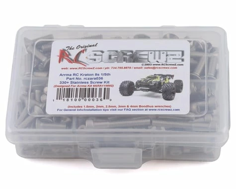 This is a optional RCScrewz Stainless Steel Screw kit for the Arrma Kraton 8S. RCScrewz Stainless Screw Kits are 100% complete. Your screw kit will include everything needed to do a full conversion and more. Stainless Steel Screw Kits are far superior to the screws that come stock with your RC. RCScrewz kits are made with the best stainless steel money can buy. No more bent, rusted, or corroded screws. Never worry about stripped heads again. You will not find a better screw kit for your RC at any price and RCScrewz Guarantee’s it. If for any reason your not 100% satisfied with your kit, return your screw kit to RCScrewz and they will send you a full refund for the price of the kit.Â