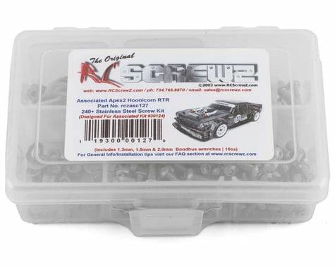 This is an optional RCScrewz Stainless Steel screw kit for the Team Associated Apex2 Hoonicorn. RCScrewz Stainless Screw Kits are 100% complete. Your kit will include everything needed to do a full conversion and more. Stainless Steel Screw Kits are far superior to the screws that come stock with your RC. RCScrewz kits are made with the best stainless steel money can buy. No more bent, rusted, or corroded screws. Never worry about stripped heads again. You will not find a better screw kit for your RC at any price and RCScrewz Guarantee it.
