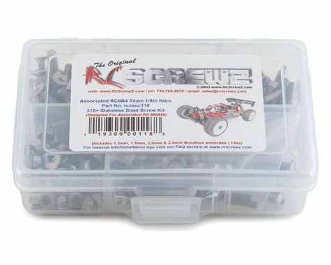 This is a optional RCScrewz Associated RC8B4 Stainless Steel Screw Kit. RCScrewz Stainless Screw Kits are 100% complete. Your screw kit will include everything needed to do a full conversion and more. Stainless Steel Screw Kits are far superior to the screws that come stock with your RC. RCScrewz kits are made with the best stainless steel money can buy. No more bent, rusted, or corroded screws. Never worry about stripped heads again. You will not find a better screw kit for your RC at any price and RCScrewz Guarantee’s it. If for any reason your not 100% satisfied with your kit, return your screw kit to RCScrewz and they will send you a full refund for the price of the kit. Â