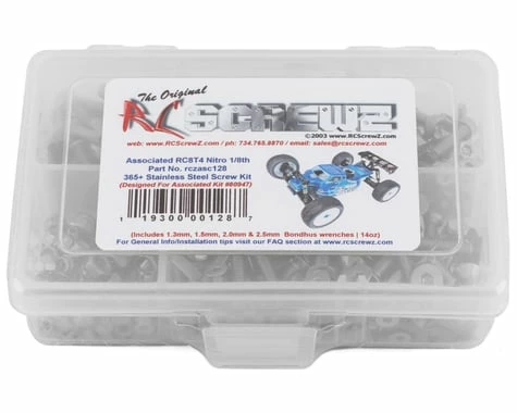 This is an optional RCScrewz Stainless Steel screw kit for the Team Associated RC8T4 Nitro Truggy. RCScrewz Stainless Screw Kits are 100% complete. Your kit will include everything needed to do a full conversion and more. Stainless Steel Screw Kits are far superior to the screws that come stock with your RC. RCScrewz kits are made with the best stainless steel money can buy. No more bent, rusted, or corroded screws. Never worry about stripped heads again. You will not find a better screw kit for your RC at any price and RCScrewz Guarantee it.