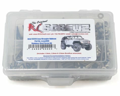 This is an optional RCScrewz Axial SCX10 AXI009 Stainless Steel Screw Kit. RCScrewz stainless screw kits are 100% complete. This kit was developed specifically for the SCX10 Jeep Wrangler Rubicon and may not include the screws needed for other SCX10 kits. Your kit will include everything needed to do a full conversion and more. Stainless steel screw kits are far superior to the screws that come stock with your RC. RCScrewz kits are made with the best stainless steel money can buy. No more bent, rusted, or corroded screws. Never worry about stripped heads again. You will not find a better screw kit for your RC at any price and RCScrewz Guarantee’s it. If for any reason your not 100% satisfied with your kit, return your screw kit to RCScrewz and they will send you a full refund for the price of the kit.