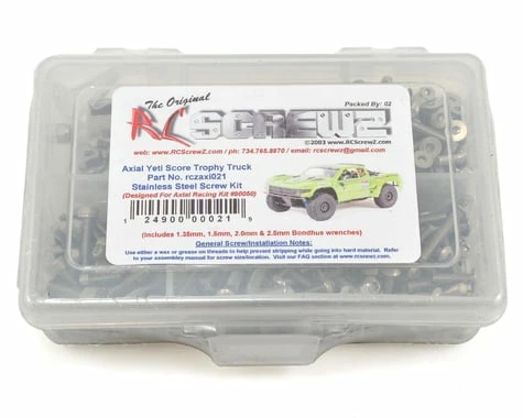 RCScrewz Axial Yeti Score Trophy Truck Stainless Steel Screw Kits are 100% complete. Your kit will include everything needed to do a full conversion and more. Stainless Steel Screw Kits are far superior to the screws that come stock with your RC. RCScrewz kits are made with the best stainless steel money can buy. No more bent, rusted, or corroded screws. Never worry about stripped heads again. You will not find a better screw kit for your RC at any price and RCScrewz Guarantee’s it. If for any reason your not 100% satisfied with your kit, return your screw kit to RCScrewz and they will send you a full refund for the price of the kit.