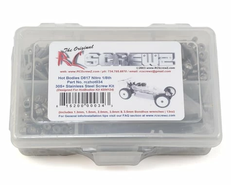 This is an optional RCScrewz Stainless Steel screw kit for the HB D817. RCScrewz Stainless Screw Kits are 100% complete. Your kit will include everything needed to do a full conversion and more. Stainless Steel Screw Kits are far superior to the screws that come stock with your RC. RCScrewz kits are made with the best stainless steel money can buy. No more bent, rusted, or corroded screws. Never worry about stripped heads again. You will not find a better screw kit for your RC at any price and RCScrewz Guarantee’s it. If for any reason you’re not 100% satisfied with your kit, return your screw kit to RCScrewz and they will send you a full refund for the price of the kit.
