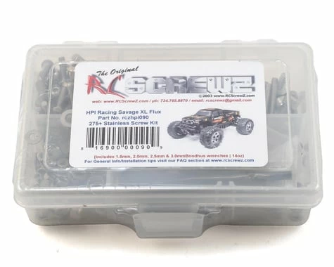 This is an optional RCScrewz Stainless Steel screw kit for the HPI Savage XL Flux. RCScrewz Stainless Screw Kits are 100% complete. Your kit will include everything needed to do a full conversion and more. Stainless Steel Screw Kits are far superior to the screws that come stock with your RC. RCScrewz kits are made with the best stainless steel money can buy. No more bent, rusted, or corroded screws. Never worry about stripped heads again. You will not find a better screw kit for your RC at any price and RCScrewz Guarantee’s it. If for any reason you’re not 100% satisfied with your kit, return your screw kit to RCScrewz and they will send you a full refund for the price of the kit.