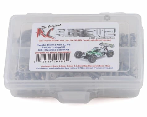 This is a optional RCScrewz Kyosho Inferno NEO 3.0 VE Stainless Steel Screw Kit. RCScrewz Stainless Screw Kits are 100% complete. Your new kit will include everything needed to do a full conversion and more. Stainless Steel Screw Kits are far superior to the screws that come stock with your RC. RCScrewz kits are made with the best stainless steel money can buy. No more bent, rusted, or corroded screws. Never worry about stripped heads again. You will not find a better screw kit for your RC at any price and RCScrewz Guarantee’s it. If for any reason your not 100% satisfied with your kit, return your screw kit to RCScrewz and they will send you a full refund for the price of the kit.Â
