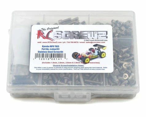 This is an optional RCScrewz Stainless Steel Screw Kit, and is intended for use with the Kyosho MP9 TKI3 1/8 scale buggy. RCScrewz Stainless Screw Kits are 100% complete. Your kit will include everything needed to do a full conversion and more. Stainless Steel Screw Kits are far superior to the screws that come stock with your RC. RCScrewz kits are made with the best stainless steel money can buy. No more bent, rusted, or corroded screws. Never worry about stripped heads again. You will not find a better screw kit for your RC at any price and RCScrewz Guarantee’s it. If for any reason your not 100% satisfied with your kit, return your screw kit to RCScrewz and they will send you a full refund for the price of the kit.