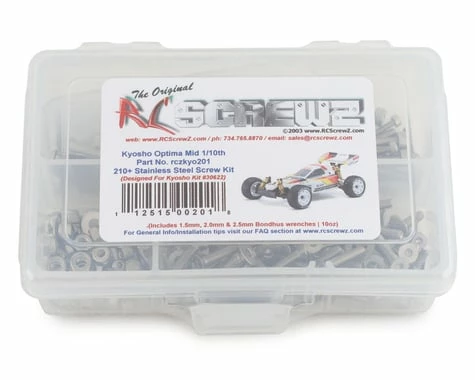This is an optional RCScrewz Stainless Steel screw kit for the Kyosho Optima Mid buggy. RCScrewz Stainless Screw Kits are 100% complete. Your kit will include everything needed to do a full conversion and more. Stainless Steel Screw Kits are far superior to the screws that come stock with your RC. RCScrewz kits are made with the best stainless steel money can buy. No more bent, rusted, or corroded screws. Never worry about stripped heads again. You will not find a better screw kit for your RC at any price and RCScrewz Guarantee’s it. If for any reason you’re not 100% satisfied with your kit, return your screw kit to RCScrewz and they will send you a full refund for the price of the kit.