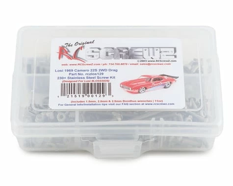 This is a optional RCScrewz Stainless Steel screw kit for the Losi 1969 Camaro 22S Drag Car. RCScrewz Stainless Screw Kits are 100% complete. Your kit will include everything needed to do a full conversion and more. Stainless Steel Screw Kits are far superior to the screws that come stock with your RC. RCScrewz kits are made with the best stainless steel money can buy. No more bent, rusted, or corroded screws. Never worry about stripped heads again. You will not find a better screw kit for your RC at any price and RCScrewz Guarantee’s it. If for any reason your not 100% satisfied with your kit, return your screw kit to RCScrewz and they will send you a full refund for the price of the kit. Â