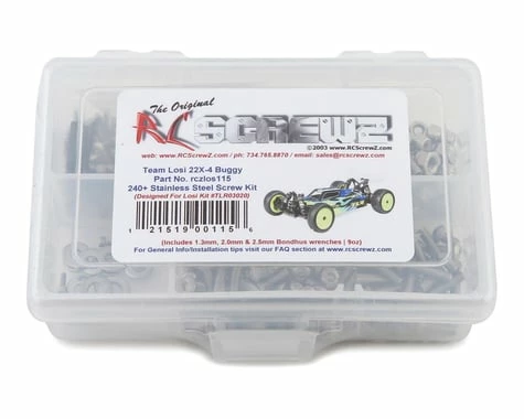 This is a optional RCScrewz Stainless Steel screw kit for the Losi 22X-4 Buggy. This 240+ piece screw kit is 100% complete. Your kit will include everything needed to do a full conversion and more. Stainless Steel Screw Kits are far superior to the screws that come stock with your RC. RCScrewz kits are made with the best stainless steel money can buy. No more bent, rusted, or corroded screws. Never worry about stripped heads again. You will not find a better screw kit for your RC at any price and RCScrewz Guarantee’s it. If for any reason your not 100% satisfied with your kit, return your screw kit to RCScrewz and they will send you a full refund for the price of the kit.
