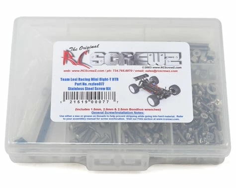 This is a optional RCScrewz Stainless Steel screw kit for the Losi Mini 8ight-T. RCScrewz Stainless Screw Kits are 100% complete. Your kit will include everything needed to do a full conversion and more. Stainless Steel Screw Kits are far superior to the screws that come stock with your RC. RCScrewz kits are made with the best stainless steel money can buy. No more bent, rusted, or corroded screws. Never worry about stripped heads again. You will not find a better screw kit for your RC at any price and RCScrewz Guarantee’s it. If for any reason your not 100% satisfied with your kit, return your screw kit to RCScrewz and they will send you a full refund for the price of the kit.