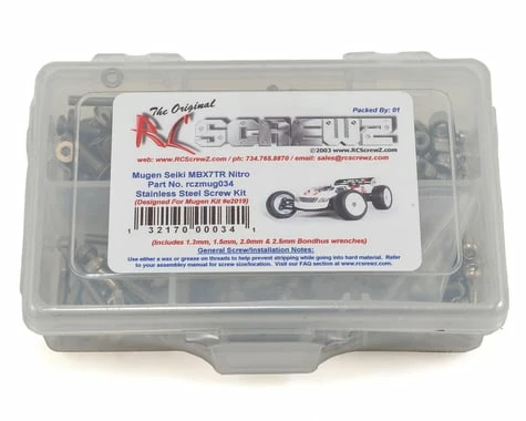 This is a optional RCScrewz Stainless Steel Metric screw kit for the Mugen MBX7TR Nitro. RCScrewz Stainless Screw Kits are 100% complete. Your kit will include everything needed to do a full conversion and more. Stainless Steel Screw Kits are far superior to the screws that come stock with your RC. RCScrewz kits are made with the best stainless steel money can buy. No more bent, rusted, or corroded screws. Never worry about stripped heads again. You will not find a better screw kit for your RC at any price and RCScrewz Guarantee’s it. If for any reason your not 100% satisfied with your kit, return your screw kit to RCScrewz and they will send you a full refund for the price of the kit.