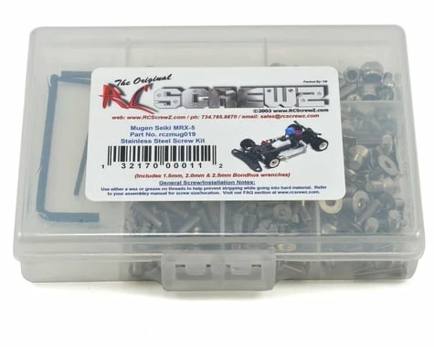 This is an optional RCScrewz Stainless Steel screw kit forthe Mugen MRX-5. RCScrewz Stainless Screw Kits are 100% complete.Your new kit will include everything needed to do a full conversion andmore. Stainless Steel Screw Kits are far superior to the screws thatcome stock with your RC. RCScrewz kits are made with the best stainlesssteel money can buy. No more bent, rusted, or corroded screws. Neverworry about stripped heads again. You will not find a better screw kitfor your RC at any price and RCScrewz Guarantee’s it. If for any reasonyour not 100% satisfied with your kit, return your screw kit toRCScrewz and they will send you a full refund for the price of the kit.