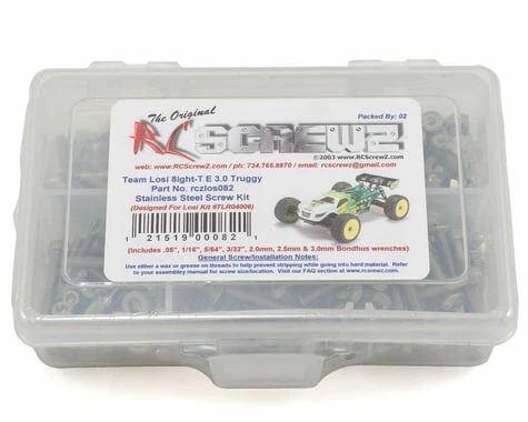 This is a optional RCScrewz Stainless Steel Metric screw kit for the Team Losi Losi 8IGHT-T E 3.0. RCScrewz Stainless Screw Kits are 100% complete. Your kit will include everything needed to do a full conversion and more. Stainless Steel Screw Kits are far superior to the screws that come stock with your RC. RCScrewz kits are made with the best stainless steel money can buy. No more bent, rusted, or corroded screws. Never worry about stripped heads again. You will not find a better screw kit for your RC at any price and RCScrewz Guarantee’s it. If for any reason your not 100% satisfied with your kit, return your screw kit to RCScrewz and they will send you a full refund for the price of the kit.