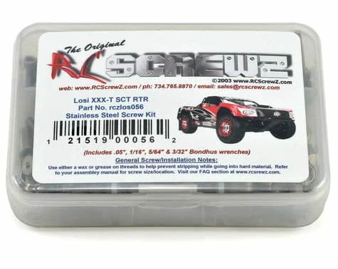 This is an optional RCScrewz Stainless Steel screw kit forthe Losi XXX-T SCT. RCScrewz Stainless Screw Kits are 100% complete. Your new kit will include everything needed to do a full conversion andmore. Stainless Steel Screw Kits are far superior to the screws thatcome stock with your RC. RCScrewz kits are made with the best stainlesssteel money can buy. No more bent, rusted, or corroded screws. Neverworry about stripped heads again. You will not find a better screw kitfor your RC at any price and RCScrewz Guarantee’s it. If for any reasonyour not 100% satisfied with your kit, return your screw kit toRCScrewz and they will send you a full refund for the price of the kit.