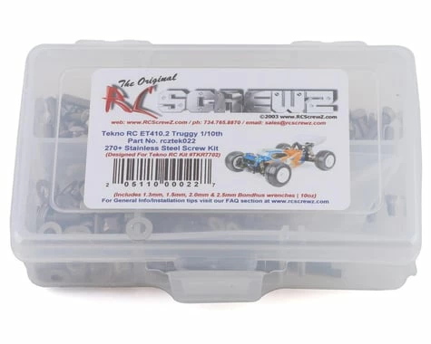 This is a optional RCScrewz Tekno ET410.2 4wd Stainless Steel Screw Kit. RCScrewz Stainless Screw Kits are 100% complete. Your screw kit will include everything needed to do a full conversion and more. Stainless Steel Screw Kits are far superior to the screws that come stock with your RC. RCScrewz kits are made with the best stainless steel money can buy. No more bent, rusted, or corroded screws. Never worry about stripped heads again. You will not find a better screw kit for your RC at any price and RCScrewz Guarantee’s it. If for any reason your not 100% satisfied with your kit, return your screw kit to RCScrewz and they will send you a full refund for the price of the kit.Â