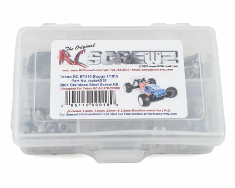 This is an optional RCScrewz Stainless Steel screw kit for the Tekno ET410 Truggy. RCScrewz Stainless Screw Kits are 100% complete. Your kit will include everything needed to do a full conversion and more. Stainless Steel Screw Kits are far superior to the screws that come stock with your RC. RCScrewz kits are made with the best stainless steel money can buy. No more bent, rusted, or corroded screws. Never worry about stripped heads again. You will not find a better screw kit for your RC at any price and RCScrewz Guarantee’s it. If for any reason you’re not 100% satisfied with your kit, return your screw kit to RCScrewz and they will send you a full refund for the price of the kit.