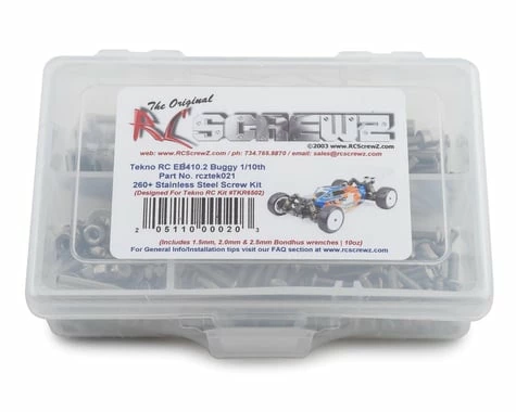 This is a optional RCScrewz Stainless Steel screw kit for the Tekno RC EB410 2.0 buggy. This 260+ piece screw kit is 100% complete. Your kit will include everything needed to do a full conversion and more. Stainless Steel Screw Kits are far superior to the screws that come stock with your RC. RCScrewz kits are made with the best stainless steel money can buy. No more bent, rusted, or corroded screws. Never worry about stripped heads again. You will not find a better screw kit for your RC at any price and RCScrewz Guarantee’s it. If for any reason your not 100% satisfied with your kit, return your screw kit to RCScrewz and they will send you a full refund for the price of the kit.