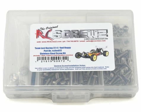 This is an RCScrewz TLR 22-4 4wd Buggy Stainless Steel Screw Kit. The RCScrewZ Stainless Screw Kit is 100% complete and includes everything needed to do a full conversion and more. The quality of the Stainless Steel Screw Kits far surpasses any stock screws included with you RC; forget about stripped heads and bent, corroded, or rusted screws. You will not find a better screw kit for your RC at any price and RCScrewz Guarantee’s it. If for any reason your not 100% satisfied with your kit, return your screw kit to RCScrewz and they will send you a full refund for the price of the kit.