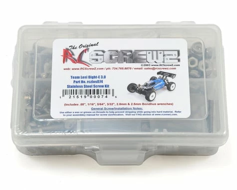 This is an RCScrewz TLR 8IGHT-E 3.0 Buggy Stainless Steel Screw Kit. The RCScrewZ Stainless Screw Kit is 100% complete and includes everything needed to do a full conversion and more. The quality of the Stainless Steel Screw Kits far surpasses any stock screws included with you RC; forget about stripped heads and bent, corroded, or rusted screws. You will not find a better screw kit for your RC at any price and RCScrewz Guarantee’s it. If for any reason your not 100% satisfied with your kit, return your screw kit to RCScrewz and they will send you a full refund for the price of the kit.