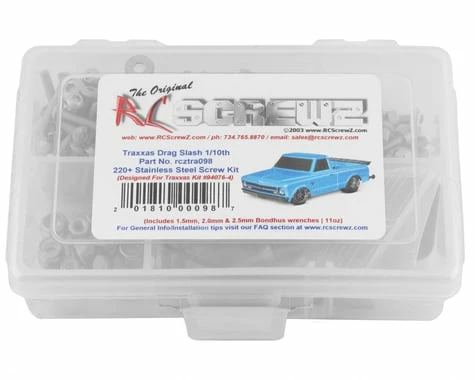 This is a optional RCScrewz Stainless Steel screw kit for the Traxxas Drag Slash Stainless Steel Screw Kit. RCScrewz Stainless Screw Kits are 100% complete. Your kit will include everything needed to do a full conversion and more. Stainless Steel Screw Kits are far superior to the screws that come stock with your RC. RCScrewz kits are made with the best stainless steel money can buy. No more bent, rusted, or corroded screws. Never worry about stripped heads again. You will not find a better screw kit for your RC at any price and RCScrewz Guarantee’s it. If for any reason your not 100% satisfied with your kit, return your screw kit to RCScrewz and they will send you a full refund for the price of the kit.Â