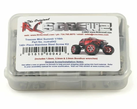 This is a optional RCScrewz Stainless Steel 140 plus piece screw kit for the Traxxas 1/16 Summit. RCScrewz Stainless Screw Kits are 100% complete. Your new kit will include everything needed to do a full conversion and more. Stainless Steel Screw Kits are far superior to the screws that come stock with your RC. RCScrewz kits are made with the best stainless steel money can buy. No more bent, rusted, or corroded screws. Never worry about stripped heads again. You will not find a better screw kit for your RC at any price and RCScrewz Guarantee’s it. If for any reason your not 100% satisfied with your kit, return your screw kit to RCScrewz and they will send you a full refund for the price of the kit.