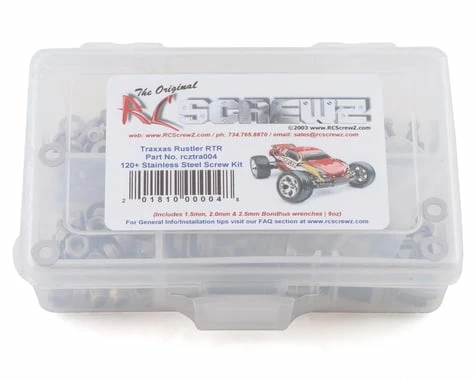 RC Screwz Traxxas Rustler Screw Set. This optional screw kit comes with a complete set of screws, washers and nuts to convert your Rustler to stainless hardware.Â