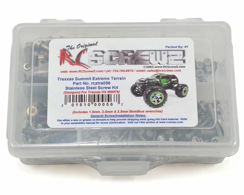 This is a optional RCScrewz Stainless Steel screw kit for the Traxxas Summit Extreme. RCScrewz Stainless Screw Kits are 100% complete. Your kit will include everything needed to do a full conversion and more. Stainless Steel Screw Kits are far superior to the screws that come stock with your RC. RCScrewz kits are made with the best stainless steel money can buy. No more bent, rusted, or corroded screws. Never worry about stripped heads again. You will not find a better screw kit for your RC at any price and RCScrewz Guarantee’s it. If for any reason your not 100% satisfied with your kit, return your screw kit to RCScrewz and they will send you a full refund for the price of the kit.