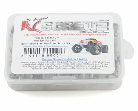 This is a optional RCScrewz Stainless Steel 200 plus piece screw kit for the Traxxas T-Maxx 2.5. RCScrewz Stainless Screw Kits are 100% complete. Your new kit will include everything needed to do a full conversion and more. Stainless Steel Screw Kits are far superior to the screws that come stock with your RC. RCScrewz kits are made with the best stainless steel money can buy. No more bent, rusted, or corroded screws. Never worry about stripped heads again. You will not find a better screw kit for your RC at any price and RCScrewz Guarantee’s it. If for any reason your not 100% satisfied with your kit, return your screw kit to RCScrewz and they will send you a full refund for the price of the kit.
