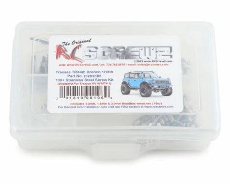 This is an optional RCScrewz Stainless Steel screw kit for the Traxxas 1/18th TRX-4M Bronco. RCScrewz Stainless Screw Kits are 100% complete. Your kit will include everything needed to do a full conversion and more. Stainless Steel Screw Kits are far superior to the screws that come stock with your RC. RCScrewz kits are made with the best stainless steel money can buy. No more bent, rusted, or corroded screws. Never worry about stripped heads again. You will not find a better screw kit for your RC at any price and RCScrewz Guarantee it.