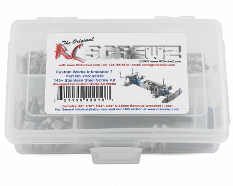 This is a optional RCScrewz Stainless Steel screw kit for the Custom Works Intimidator 7 Stainless Steel Screw Kit. RCScrewz Stainless Screw Kits are 100% complete. Your kit will include everything needed to do a full conversion and more. Stainless Steel Screw Kits are far superior to the screws that come stock with your RC. RCScrewz kits are made with the best stainless steel money can buy. No more bent, rusted, or corroded screws. Never worry about stripped heads again. You will not find a better screw kit for your RC at any price and RCScrewz Guarantee’s it. If for any reason your not 100% satisfied with your kit, return your screw kit to RCScrewz and they will send you a full refund for the price of the kit.Â
