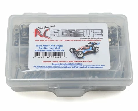This is a optional RCScrewz Stainless Steel Metric screw kit for the XRAY XB8e. RCScrewz Stainless Screw Kits are 100% complete. Your kit will include everything needed to do a full conversion and more. Stainless Steel Screw Kits are far superior to the screws that come stock with your RC. RCScrewz kits are made with the best stainless steel money can buy. No more bent, rusted, or corroded screws. Never worry about stripped heads again. You will not find a better screw kit for your RC at any price and RCScrewz Guarantee’s it. If for any reason your not 100% satisfied with your kit, return your screw kit to RCScrewz and they will send you a full refund for the price of the kit.