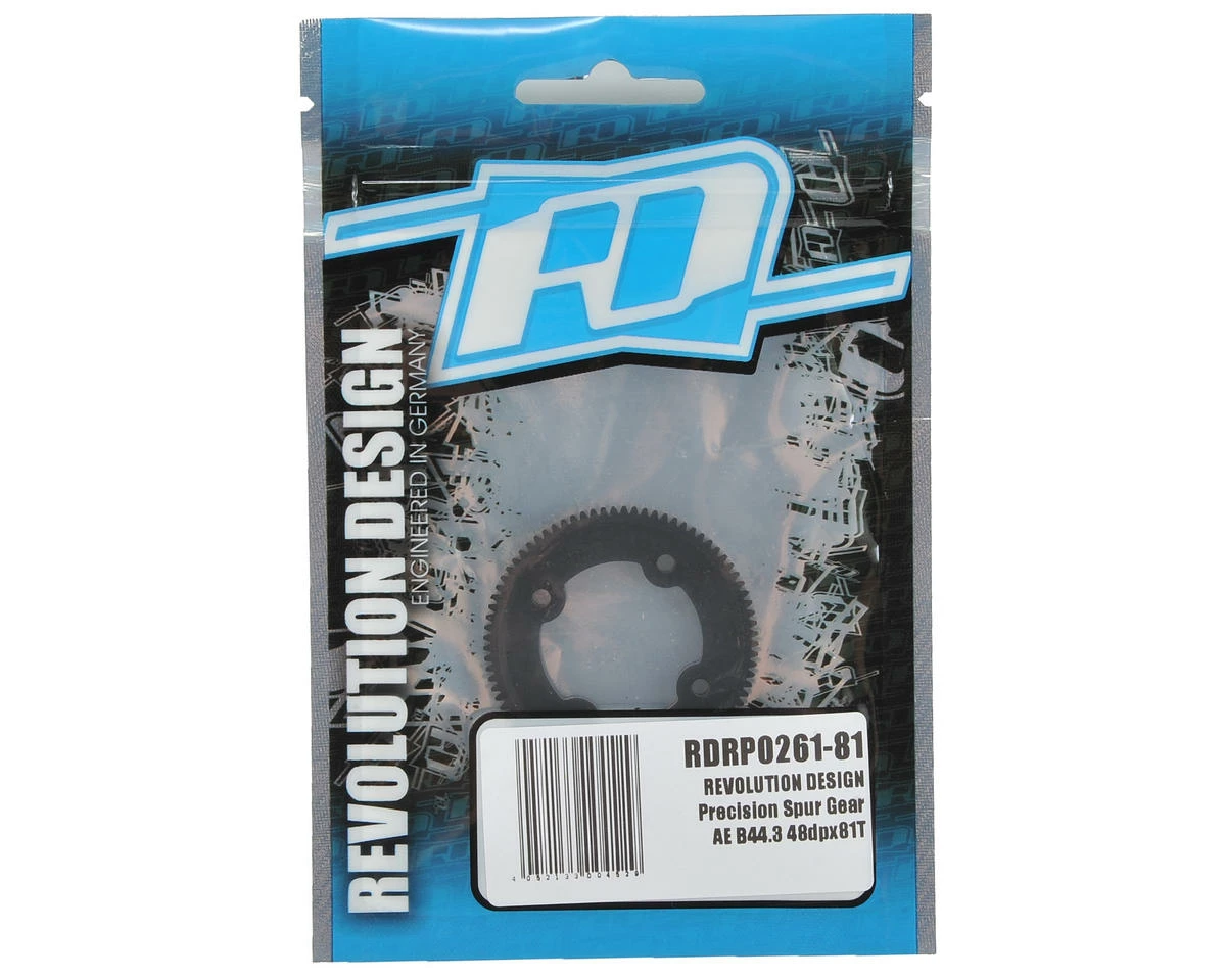 The Revolution Design Racing Product’s Precision AE44.3 Spur Gear is specially designed for the use with the Team Associated B44.3 buggy. The wide tooth Revolution2 type gears are precision machined from RDRP’s specially formulated composite material to ensure highest strength, lowest running noise and best reliability. The increased contact patch improves durability without sacrificing efficiency. The precision machining not only increases the durability of the gears but also helps when setting gear mesh.